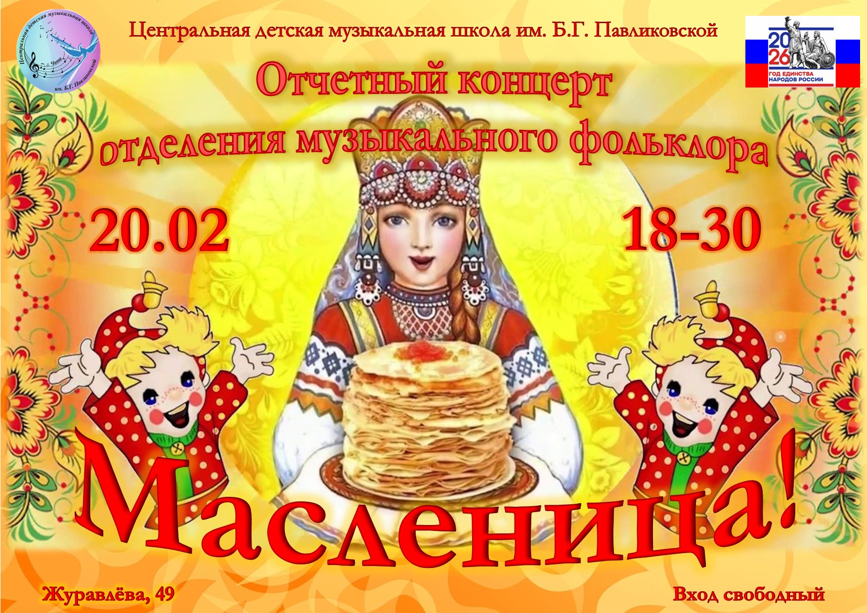 Дорогие ребята, уважаемые родители! Приглашаем Вас на отчетный концерт отделения музыкального фольклора, который состоится 20 февраля в 18-30 по адресу: ул. Журавлева, 49.